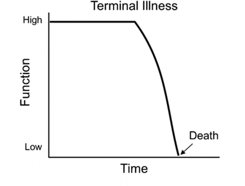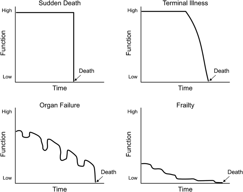 We had a steady stream of medical students passing through the hospice. When it came to prognostication, as well as the old adage, I also passed on one of the most useful graphs in medical education. It traces the four main paths by which people approach the end of their lives. Here it is: